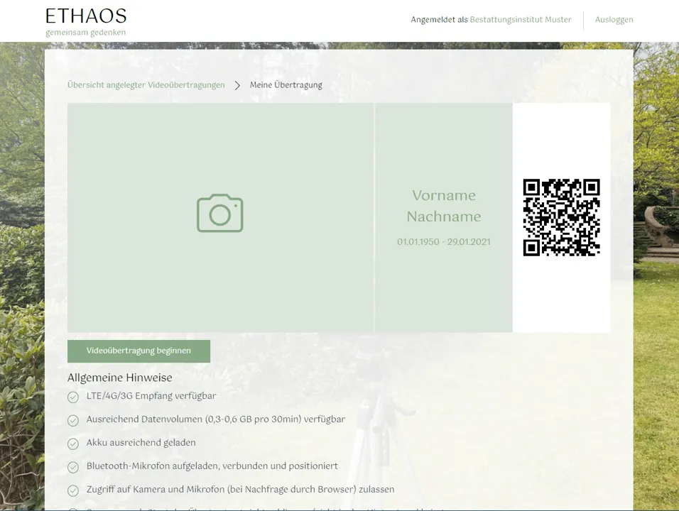 Bitte melden Sie sich als Bestattungsinstitut an, um Videoübertragungen buchen zu können. Mit der Anmeldung sind keine Kosten verbunden und Sie können ETHAOS kostenlos mit Testübertragungen ausprobieren.